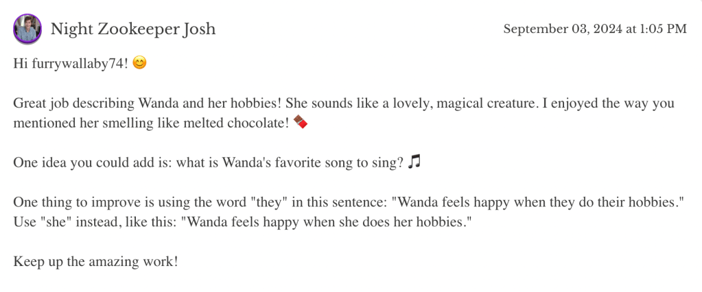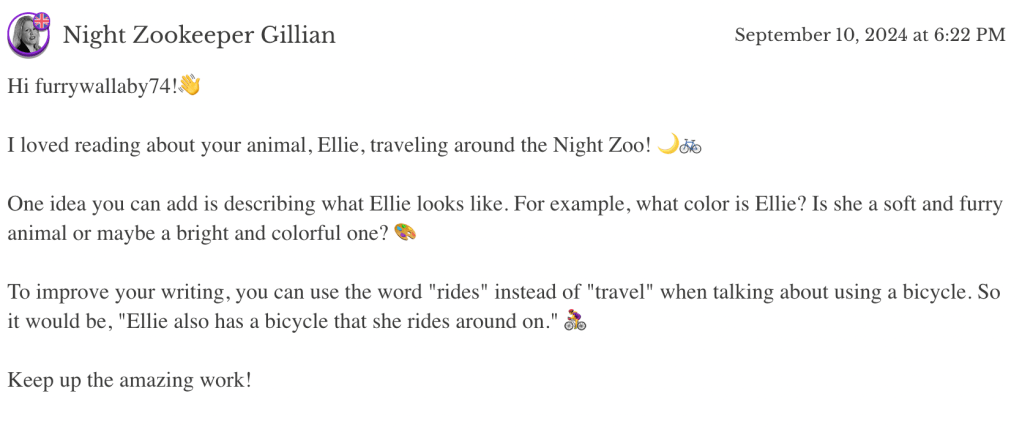 One of the big selling points of Night Zookeeper is that kids supposedly get real feedback from staff. This is highlighted as a major reason to pay for the program. Unfortunately, what I saw was disappointing at best—and actively harmful at worst.